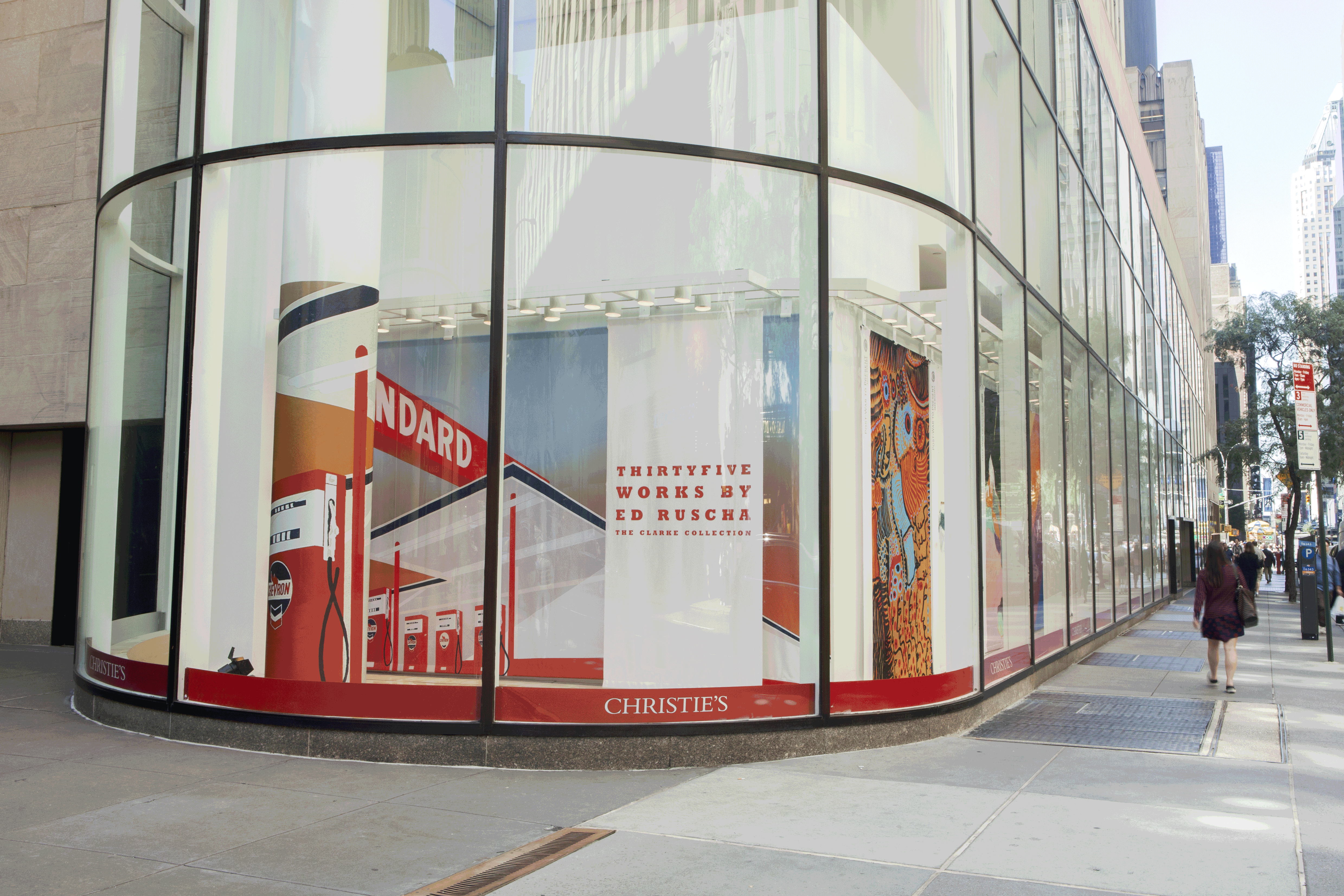 Large-scale installations at the entrance of Christie’s in Rockefeller Plaza.