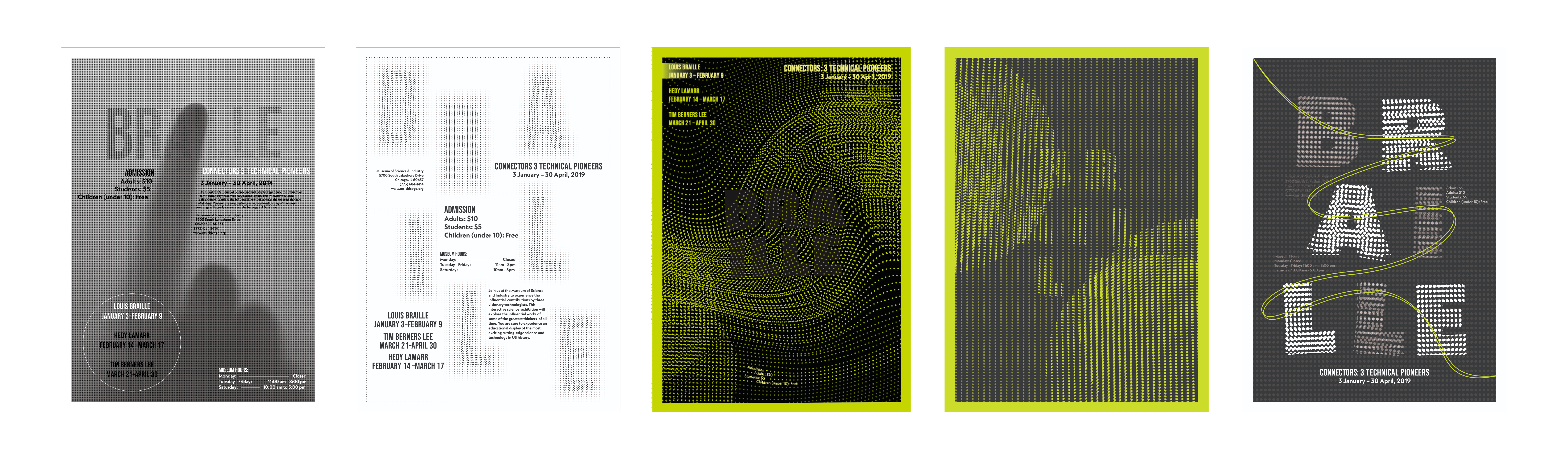 A poster series for an exhibition celebrating three technical pioneers: Hedy Lamarr, Tim Berners-Lee, and Louis Braille.